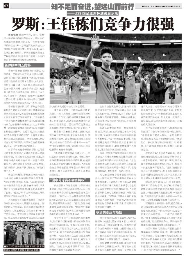 从U23亚洲杯小组赛首轮对阵伊拉克的比赛开始,浙江队的教练组就在关注着赛事直播。目的是进一步了解入选U23国家队的浙江球员的特点和状态,为他们归队后制定有针对性的训练计划。“他们需要尽快在身心上都做好准备,理解我们的战术要求。”罗斯说,球员从大赛归来后重新融入球队需要一个过程,“但幸运的是现在还在季前集训期,我们有足够的时间帮助他们调整。”